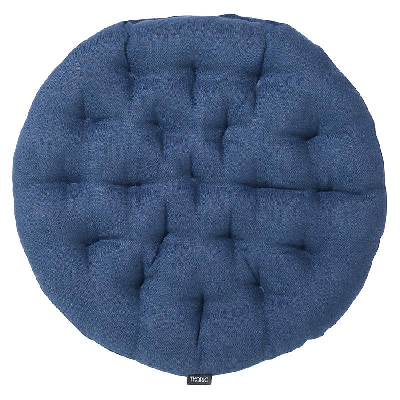 Круглая подушка на стул из стираного льна синего цвета из коллекции Essential – практичное и стильное украшение кухонной мебели. Однотонная модель в лаконичном дизайне впишется в любой интерьер. Подушку можно использовать в качестве подкладки на деревянные или металлические стулья. Благодаря плотному наполнителю из полиэстера она не потеряет форму.