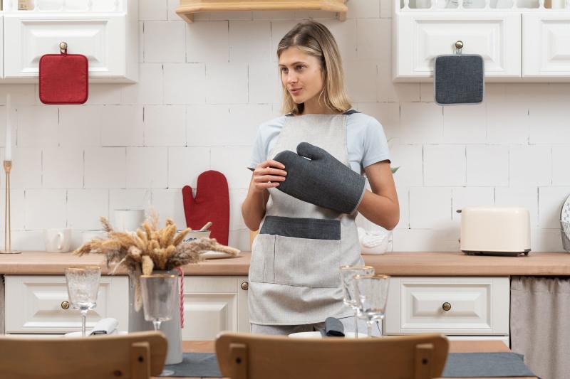 Износостойкая ткань, имитирующая лен, обработана пропиткой от грязи и воды, что делает ее применение для кухни и дома практичным, а уход — легким.