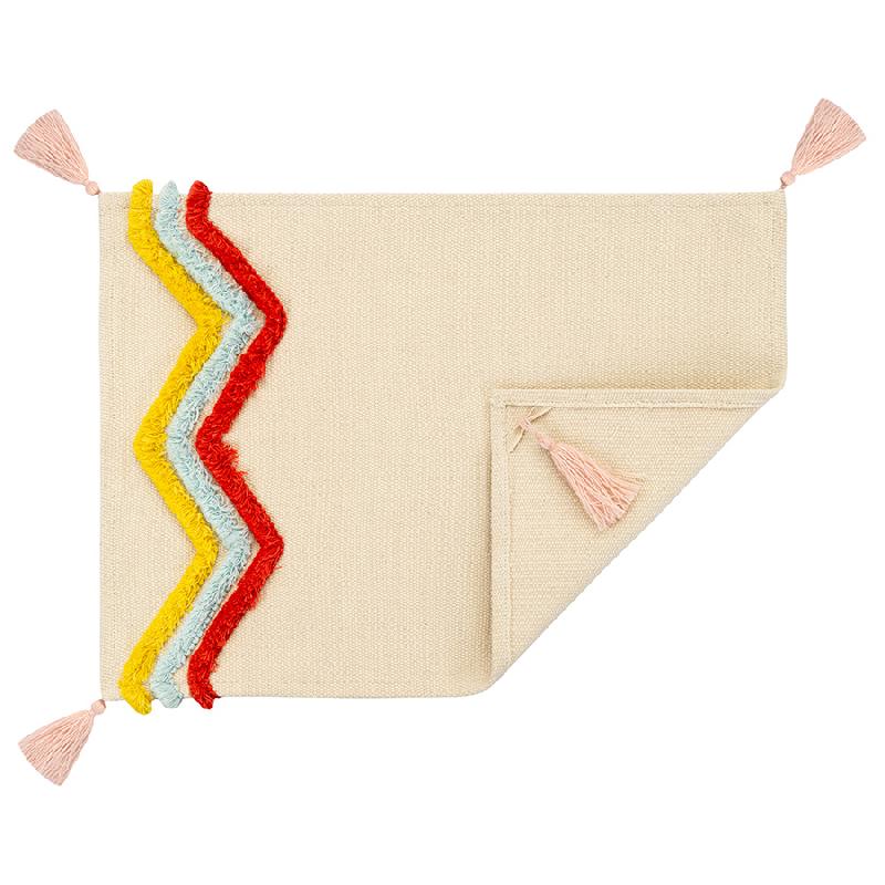 С помощью этой салфетки можно сделать повседневную сервировку чуть более изысканной, а праздничной добавить стильной многослойности. По краю салфетка декорирована объемными зигзагообразными линиями, а по углам — легкими розовыми кисточками. Несмотря на яркий, праздничный, дизайн такие салфетки очень практичны — они защищают скатерть и поверхность стола от загрязнений.