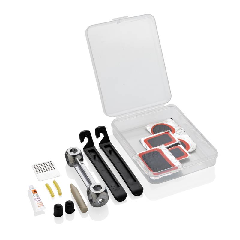 Набор для ремонта велосипеда поставляется в кейсе из полипропилена, который так просто взять с собой. В комплекте: 1 ключ из алюминиевого сплава, 2 монтажки для шин, 1 тюбик клея, 2 колпачка клапанов, 2 трубки клапанов, 1 терка, 5 ремонтных пластырей.