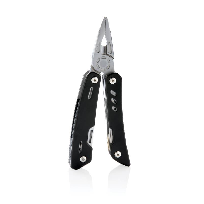 Надежный и долговечный мультитул с 12 функциями, корпус которого выполнен из алюминия, а инструменты – из нержавеющей стали. В мультитуле предусмотрены: узкогубцы, плоскогубцы, кусачки, нож, крестообразная отвертка, малая плоская отвертка, пилка, консервный нож, штопор, зубчатый нож, шило, напильник и большая плоская отвертка. Поставляется в подарочной упаковке.