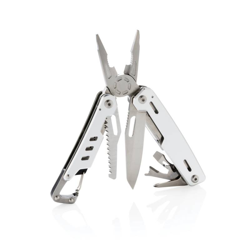Надежный и долговечный мультитул с 11 функциями. Корпус выполнен из алюминия, а инструменты — из нержавеющей стали. В мультитуле предусмотрены: узкогубцы, плоскогубцы, кусачки, нож, крестообразная отвертка Phillips, стриппер, открывалка для бутылок, плоская отвертка, консервный нож, пила и карабин для крепления. Поставляется в фирменной коробке.