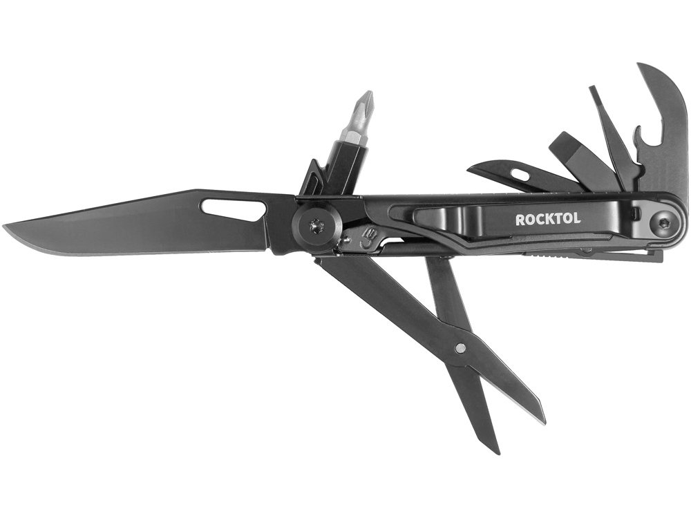 Складной карманный нож Rocktol оснащен 12 функциями все в одном, включая лезвие ножа длиной 2,68 дюйма, большие ножницы, отвертки Phillips № 1 и 3/16 дюйма, отвертки с прорезями и для стаканов, открывалки для банок и бутылок, устройство для снятия проволоки, шило, линейки и встроенный зажим для кармана.