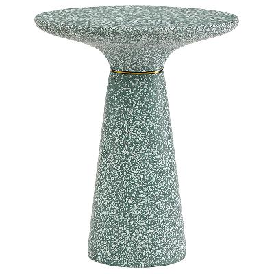 Столешница и основание столика выполнены из материала терраццо, характеризующегося высокой прочностью и устойчивостью к износу. В его состав входят мелкие кусочки натурального камня, скрепленные цементным раствором с добавлением пластификаторов. Поверхность терраццо гладкая, приятная на ощупь, прекрасно смотрится и не требует сложного ухода. Столешница диаметром 45 см позволяет размещать все необходимое – чашки кофе, десерты и прочее. При этом модель имеет компактные размеры, что способствует экономии полезного пространства.