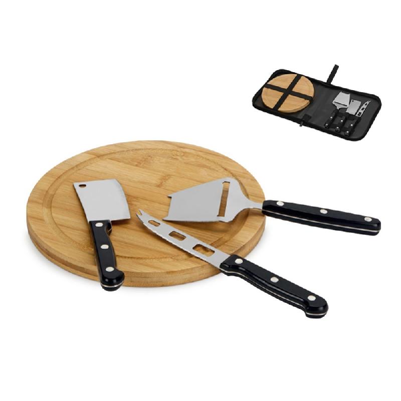 Набор для сыра: доска и три сырных ножа упакованы в чехол из искусственной кожи. Чехол на молнии раскрывается как папка, надежно защищая принадлежности от механических повреждений и позволяя компактно и удобно хранить принадлежности. Для подвешивания и переноски предусмотрена текстильная петля на корешке. Внутри чехол имеет фиксирующие резинки для каждого ножа и доски.
