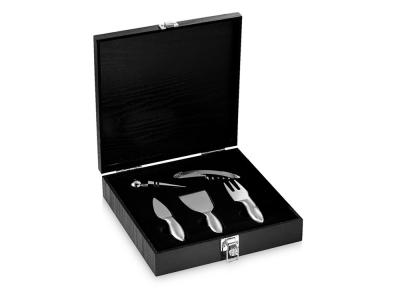 Набор для сыра и вина Mino. В этот набор из 6-ти предметов входит деревянная разделочная доска, три ножа для мягкого сыра, твердого и зрелого сыра, стоппер для вина и штопор. Набор предлагается в деревянной подарочной коробке с шильдом 40 х 25 мм для лого.