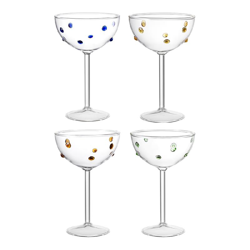 Набор креманок Pom-pon станет прекрасным приобретением для тех, кто любит необычные предметы сервировки. Такой вид посуды идеально подходит для подачи игристых вин и десертов. Коллекция привлекает внимание интересным дизайном – стенки бокалов, стаканов и креманок украшает объемный декор в виде застывших цветных капель.