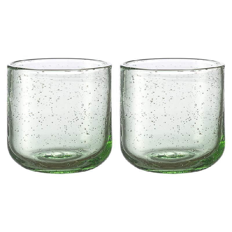 Материалы: выдувное стекло. Размеры: диаметр – 8,1 см, ширина основания – 4,5 см, высота – 8,1 см. Объем: 310 мл. Цвет: зеленые. Количество в наборе: 2 шт.
