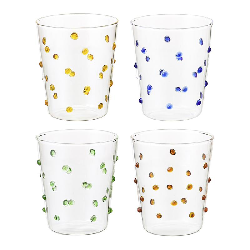 Набор из 4-х стаканов Pom-pon станет прекрасным приобретением для тех, кто любит необычные предметы сервировки. Коллекция привлекает внимание интересным дизайном – стенки посуды украшает объемный декор в виде застывших цветных капель.