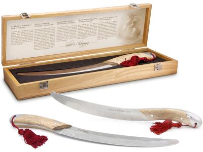 Сабраж — это необычный и очень зрелищный способ открывания шампанского, при котором горлышко бутылки не откупоривается, а сбивается вместе с пробкой. Сабля для сабража от Pulltex, испанского производителя аксессуаров для вина, создана специально для этой цели с учетом всех особенностей процесса: удобная ручка, плоское лезвие, изогнутое специально под горлышко. Рукоять выполнена из дерева, благодаря чему обеспечивается удобный хват, а кисть бордового цвета и нарядный деревянный футляр дополняют саблю, придавая ее облику торжественность.