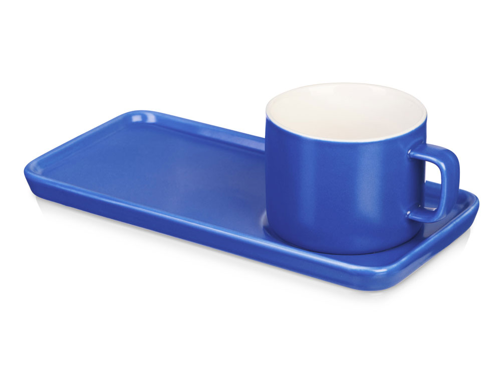 Чайная пара с необычным прямоугольным блюдцем — на нем хватит места не только для чашки, но и для пирожного. Весь силуэт этого комплекта — лаконичный, строгий, прямоугольный, что создает прекрасный фон для нанесения логотипа. Удобство этой чайной пары еще и в том, что для чашки предусмотрена отдельная ниша, которая не даст ей соскользнуть.