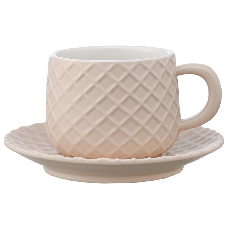 Чайная пара из коллекции Marshmallow – оптимальный вариант для тех, кто предпочитает сочетание практичности и необычного дизайна. Чашка и блюдце выполнены из каменной керамики с отличными эксплуатационными свойствами, среди которых экологичность, устойчивость к износу и температурным перепадам. Материал не впитывает запахи и загрязнения. Глазурованное покрытие легко очищается, обеспечивает изделиям декоративный вид и защищает от внешних воздействий. Узор, напоминающий соты, и интересная утолщенная ручка придают посуде особый шарм.