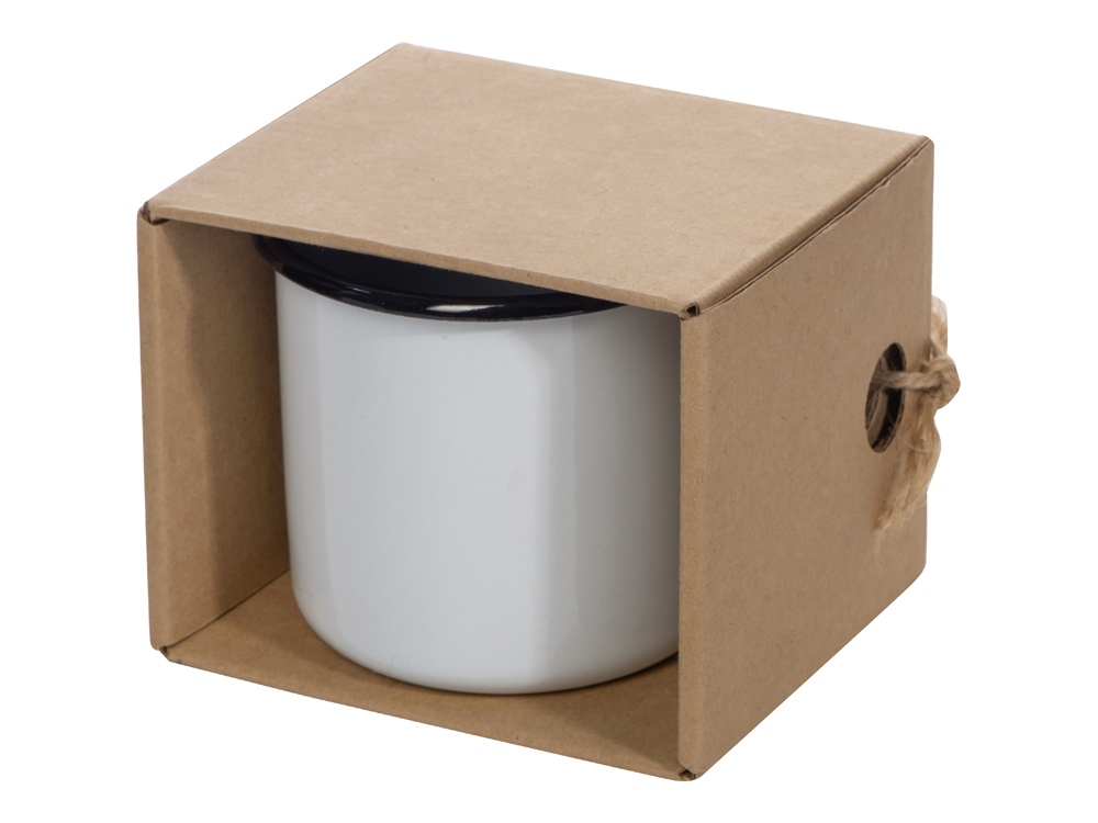 Эмалированная кружка поставляется в необычной упаковке — крафтовой коробке с открытой стенкой. Не беспокойтесь за комплектность — к упаковке кружка присоединена при помощи шпагата, продетого сквозь ручку и отверстия на углу коробки. Необычная подача создает первое впечатление от подарка, заставляя приглядеться к нему внимательнее.