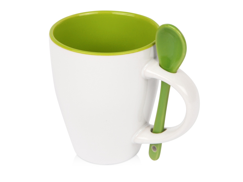 Стильная кружка на 320 мл с ложкой выполнены в контрастном сочетании цветов. Оригинальная форма ручки кружки позволяет крепить в ней ложку. Замечательный подарок для коллег по работе.