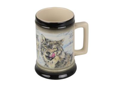 Тематическая кружка из высококачественной керамики хорошо подойдет на роль небольшого презента любителям охоты. Кружка украшена изображением санитара леса – волка. Кружка упакована в подарочную коробку бордового цвета.