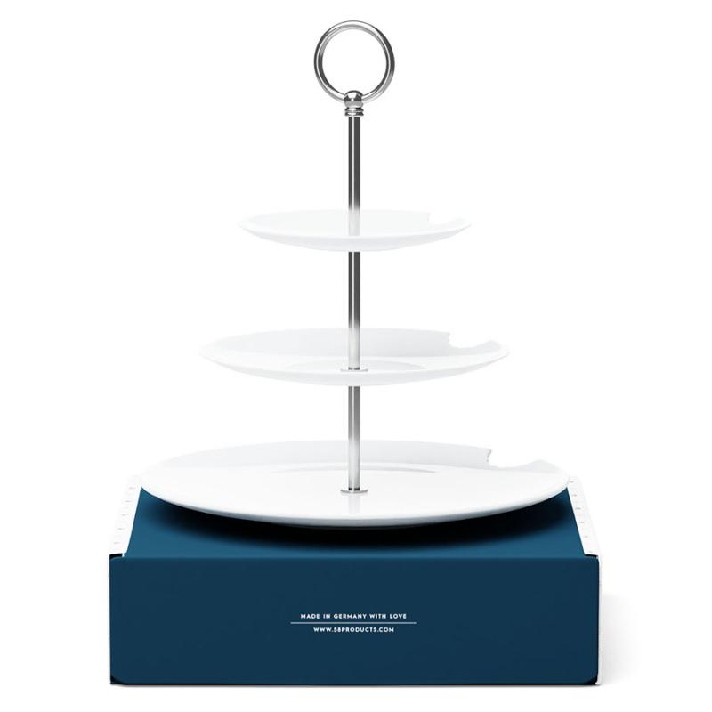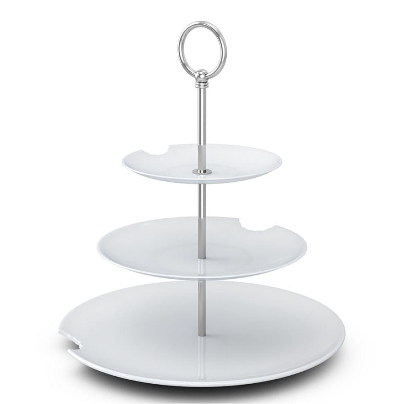 Материалы: фарфор, нержавеющая сталь. Размеры: высота – 32 см, диаметр верхней тарелки – 15 см, средней – 20 см, нижней – 28 см. Цвет тарелок – белые, стержень – серебристый.