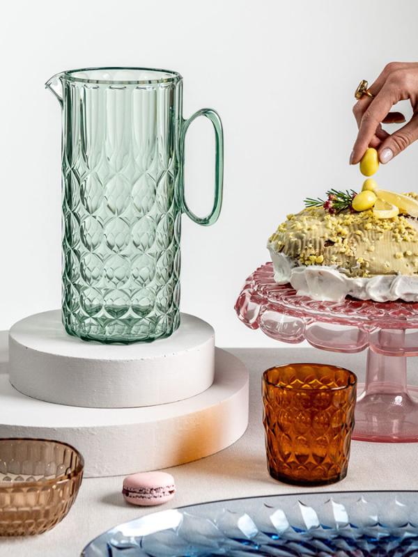 Кувшин с крышкой Vanity от итальянского бренда Guzzini – необычная посуда, в которой гармонично сочетаются привлекательный дизайн и практичность. Благодаря высокой устойчивости современного органического материала к внешним воздействиям, она идеально подходит для сервировки как в помещении, так и на свежем воздухе. Инновационный биопластик получают из растительных отходов. За счет особенной рельефной поверхности и ярких цветов предметы изящно переливаются на свету, что делает их еще более привлекательными. Материал не темнеет со временем, не выделяет вредных соединений, не меняет вкус и запах содержимого.