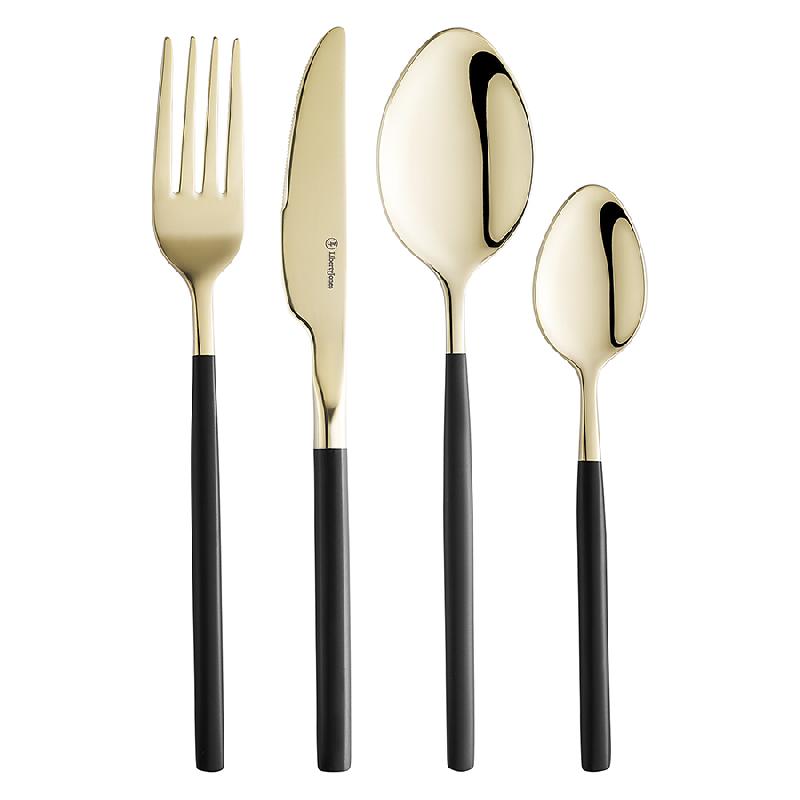 Столовые приборы Duality золотистого цвета с черными ручками украсят любую сервировку и подчеркнут вашу любовь к красивым предметам. Набор включает: 4 ножа, 4 вилки, 4 столовые ложки и 4 чайные ложки.