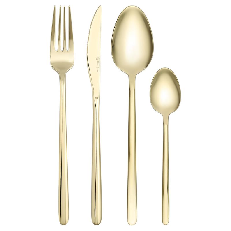 Материалы: нержавеющая сталь 430 (18/0). Длина ножа: 23,5 см. Вес ножа: 68 г. Длина вилки: 21 см. Вес вилки: 54,5 г. Длина ложки: 21,5 см. Вес ложки: 65 г. Длина чайной ложки: 15 см. Вес чайной ложки: 24,5 г. Цвет: золотистый. Полировка: зеркальная. Количество предметов в наборе: 16 шт.