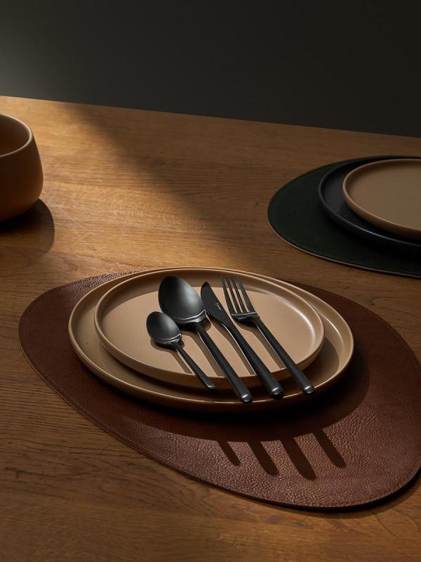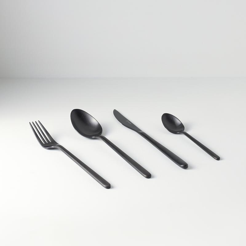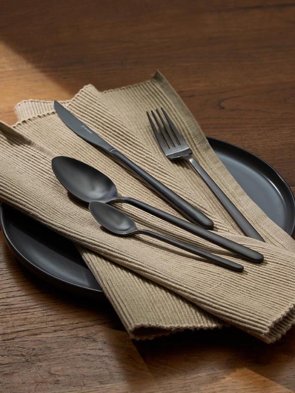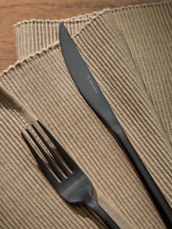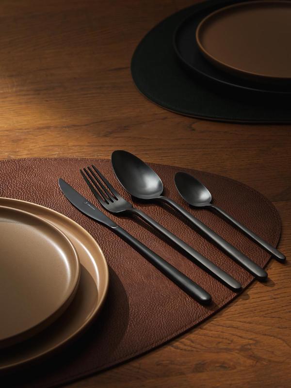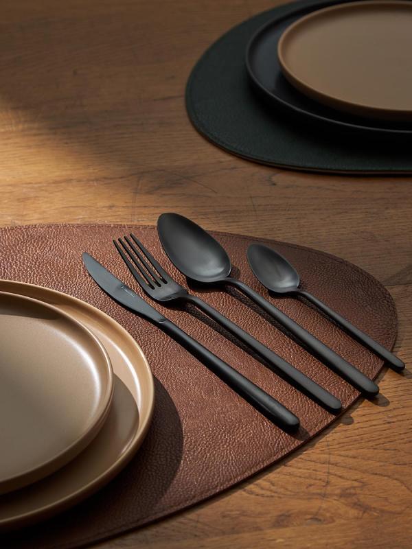 - Столовые приборы черного цвета с матовой полировкой идеально вписываются в современные решения и могут служить акцентом на фоне простых и лаконичных элементов.