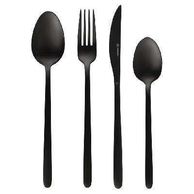 Материалы: нержавеющая сталь 430 (18/0). Длина ножа: 23,5 см. Вес ножа: 68 г. Длина вилки: 21 см. Вес вилки: 54,5 г. Длина ложки: 21,5 см. Вес ложки: 65 г. Длина чайной ложки: 15 см. Вес чайной ложки: 24,5 г. Цвет: черный. Полировка: матовая. Количество предметов в наборе: 16 шт.