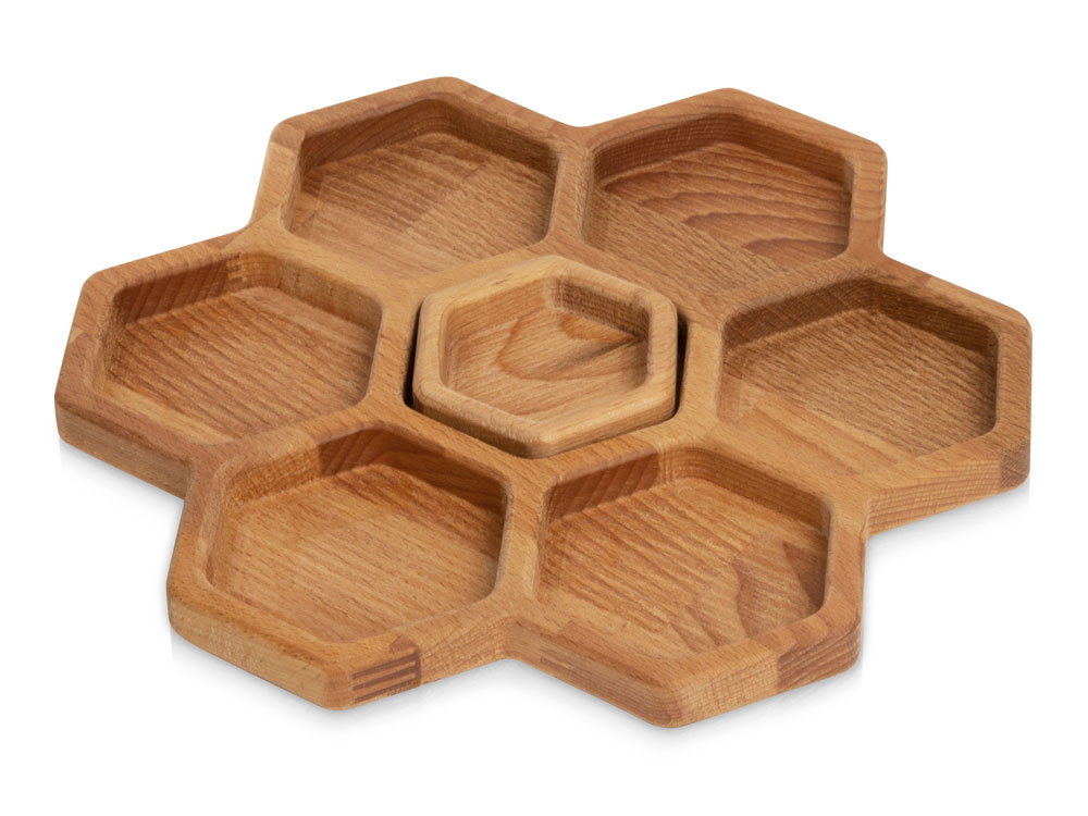 Менажница выполнена в виде семи сот для разных видов закусок — за бонусную дополнительную отвечает съемная сота-соусница, в которую можно залить мед или любимый соус.