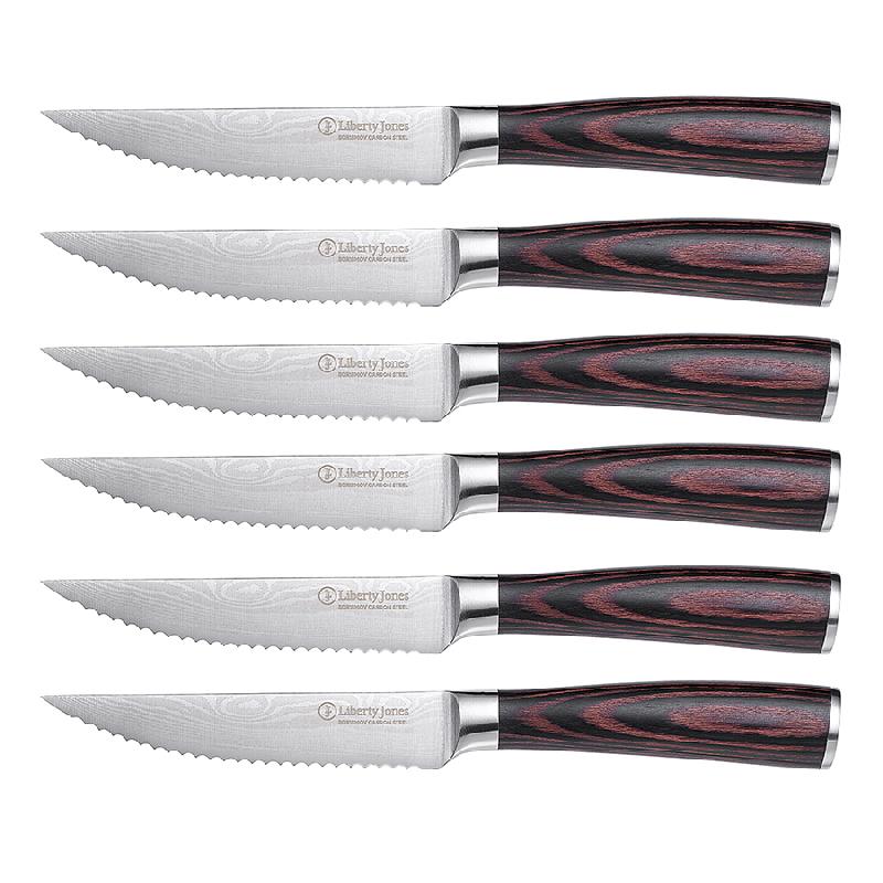 Материалы: углеродистая сталь, Pakka wood. Размеры: 2,2х28,6х2 см. Толщина лезвия: 0,2 мм. Длина клинков: 11,4 см. Угол заточки: 15-17°. Количество в наборе: 6 шт.
