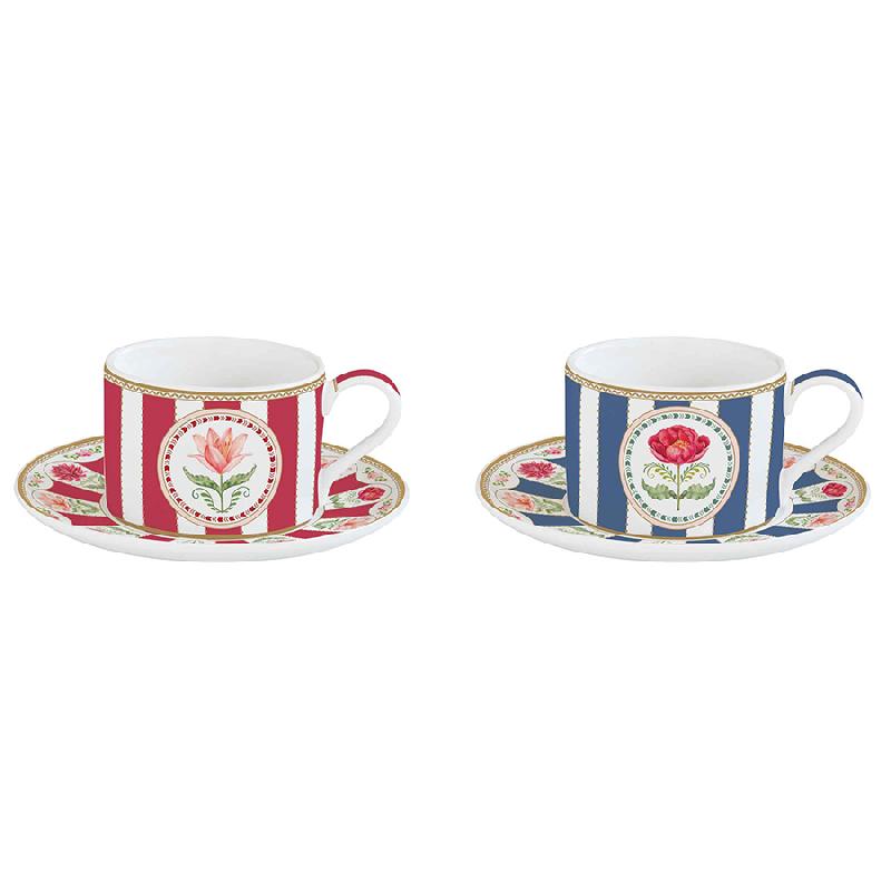 Материал: фарфор. Объем чашки: 240 мл. Высота чашки – 6,1 см, блюдца – 1,9 см; диаметр блюда – 15,9 см, ширина чашки с ручкой – 11,9 см, без ручки – 8,7 см. Количество: 2 пары (чашка+блюдце). Набор поставляется в подарочной упаковке.