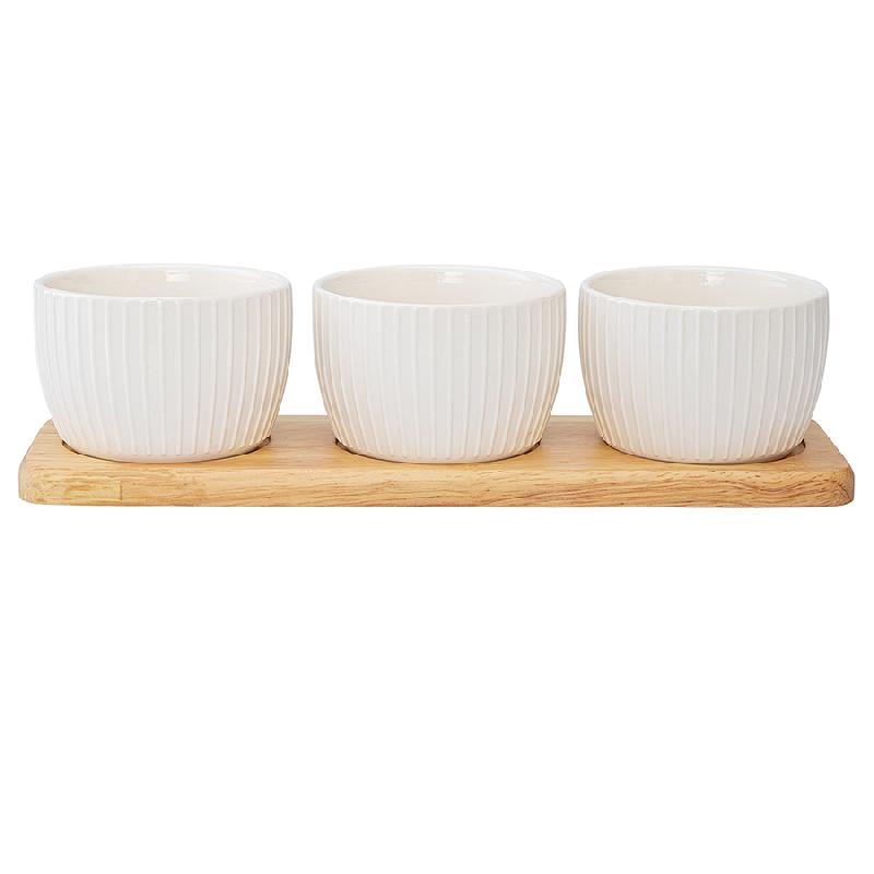 Набор чаш из коллекции Soft Ripples Dual Glazing украсит кухонный интерьер и преобразит любую сервировку. Изделия из благородного фарфора с двойной глазуровкой имеют презентабельный вид и отличные эксплуатационные характеристики. Материал неприхотлив в уходе, не впитывает загрязнения, является экологичным и безопасным для здоровья. Рельефный узор делает дизайн оригинальным. Чаши идут в комплекте с подносом из каучукового дерева, который обеспечивает удобную и красивую подачу блюд, а также защищает поверхность стола от загрязнений.