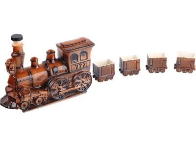 Если Ваша деятельность связана с железной дорогой, Вам будет особенно приятно видеть на своем праздничном столе набор для водки в виде паровоза и вагончиков. Паровоз выступает в роли штофа, а вагончики - в роли стопок. Причем это не массовое производство, а авторская работа.