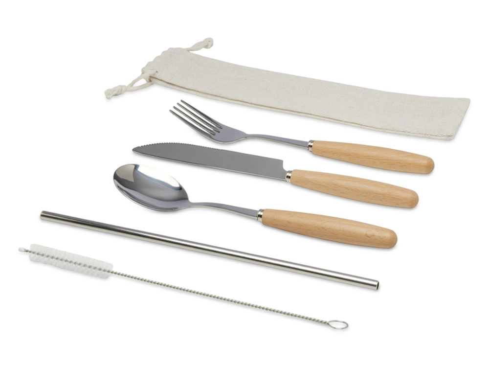 Набор столовых приборов Root — это стильное и практичное решение для тех, кто ценит удобство и экологичность. В комплект входят вилка, нож, ложка, многоразовая соломинка и щеточка для её чистки. Рабочая часть выполнена из прочной нержавеющей стали, а деревянные ручки из бука придают приборам естественный шарм и комфорт в использовании. Всё это аккуратно упаковано в компактный хлопковый мешочек — удобно брать с собой на пикник, в поездку или на работу.