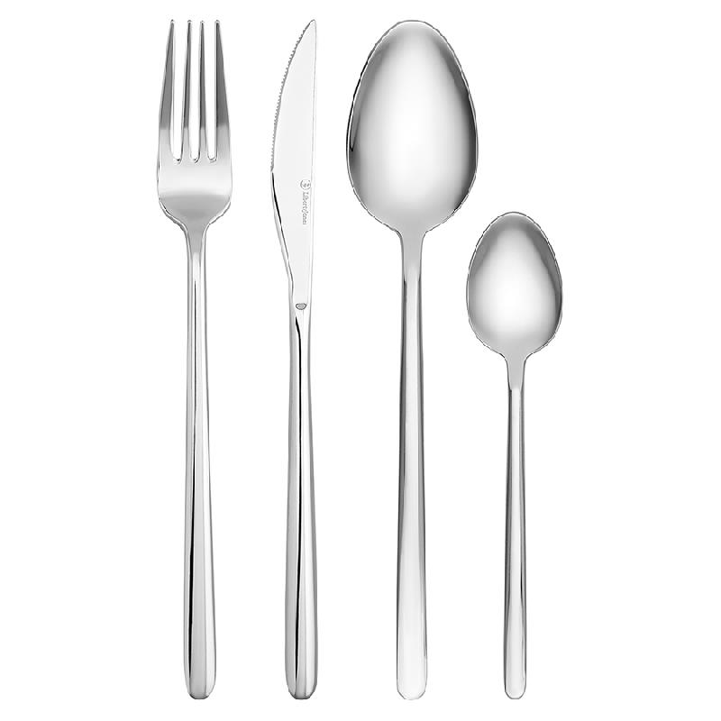 Материалы: нержавеющая сталь 430 (18/0). Длина ножа: 23,5 см. Вес ножа: 68 г. Длина вилки: 21 см. Вес вилки: 54,5 г. Длина ложки: 21,5 см. Вес ложки: 65 г. Длина чайной ложки: 15 см. Вес чайной ложки: 24,5 г. Цвет: серебристый. Полировка: зеркальная. Количество предметов в наборе: 16 шт.