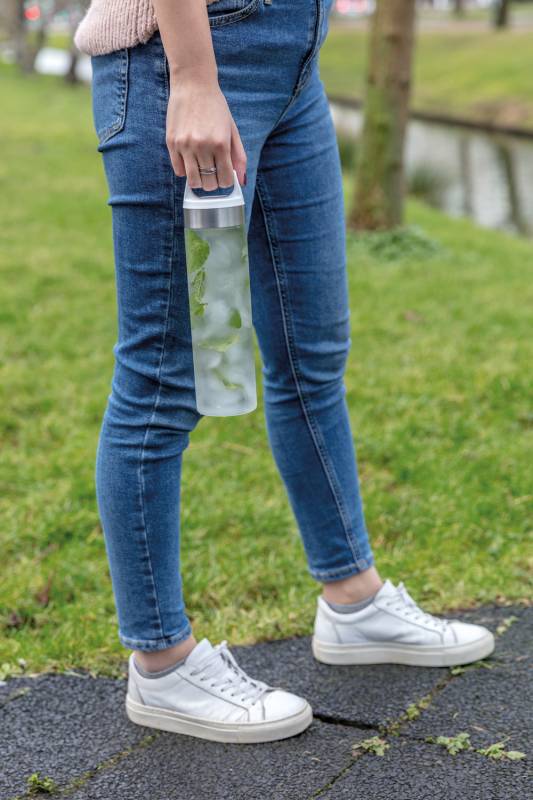 Стильная бутылка объемом 650 мл изготовлена из экологичного материала Tritan, она совершенно безопасна для здоровья и не содержит Бисфенол А. Крышка с удобной ручкой плотно закручивается на широком горлышке, благодаря чему напиток не прольется в сумке или рюкзаке. Не подходит для мытья в посудомоечной машине.