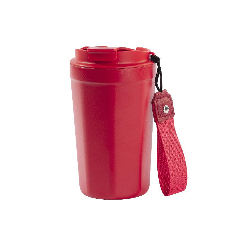 Герметичный термостакан с восьмигранной формой внешней стенки. Материал колбы 304 сталь, внешнее покрытие - порошковая краска (пудра). Крышка из  полипропилена на резьбе с силиконовым уплотнением, фиксация клапана в крайних положениях.