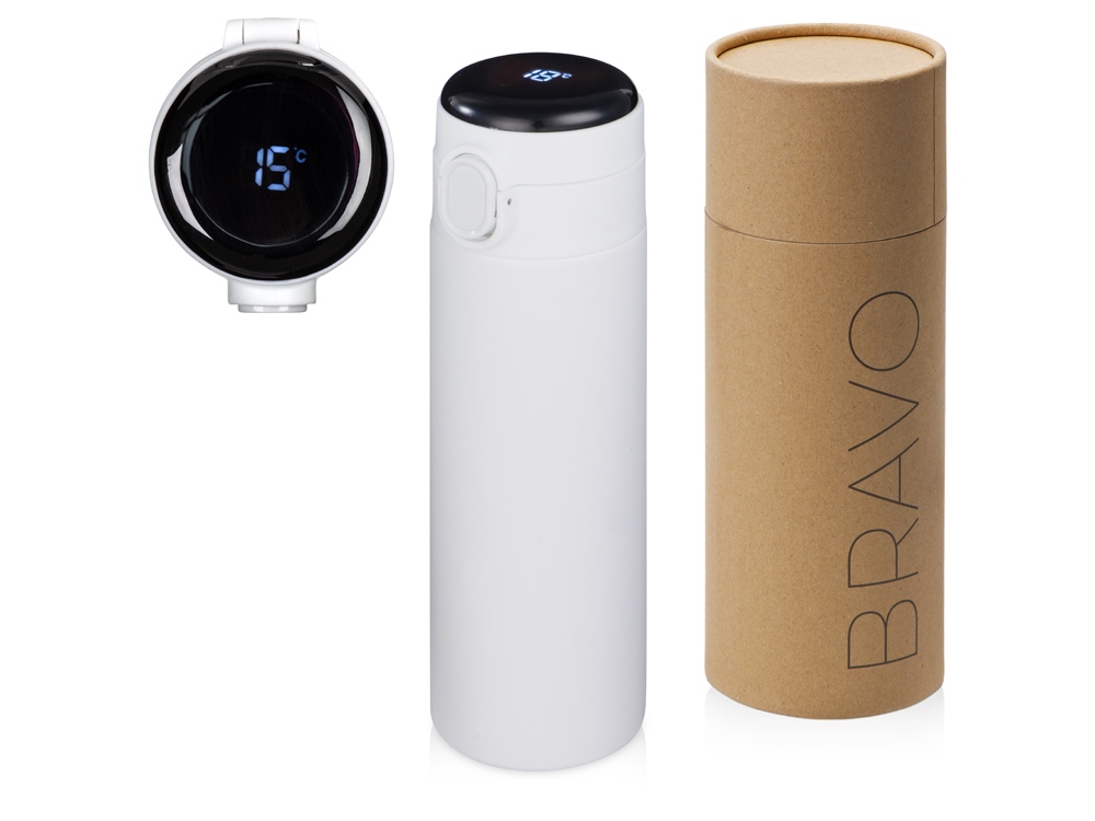 Вакуумная термокружка с медной изоляцией между стенками, которая точно не даст вам обжечься: сенсорный индикатор температуры сообщает о температуре напитка, выводя на дисплей информацию в градусах Цельсия. Что немаловажно, сенсор работает от сменной батарейки, что существенно продлит срок службы Bravo, позволяя не расставаться с полюбившейся термокружкой.