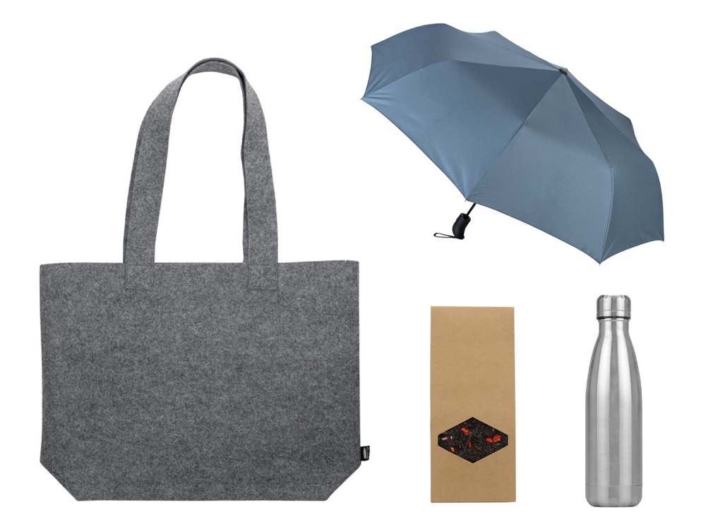 Набор подойдет как для городских прогулок, так и для выездов на природу. Термобутылка сохранит ваш напиток горячим, а зонт защитит от дождя.