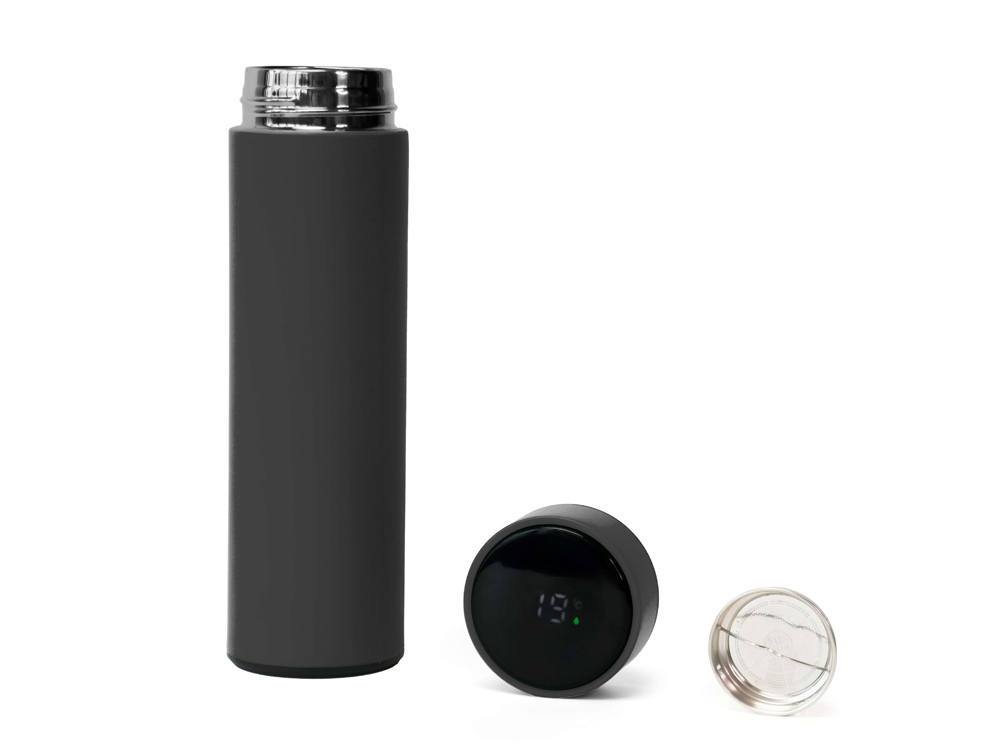 Термос из нержавеющей стали, покрытый цветным soft touch, с крышкой, в которой встроен термометр и LED дисплей, показывающий температуру внутри термоса. Объем: 500 мл. Упаковка: каждый термос в крафт коробке.