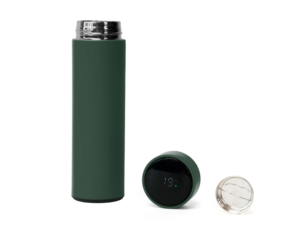 Термос из нержавеющей стали, покрытый цветным soft touch, с крышкой, в которой встроен термометр и LED дисплей, показывающий температуру внутри термоса. Объем: 500 мл. Упаковка: каждый термос в крафт коробке.
