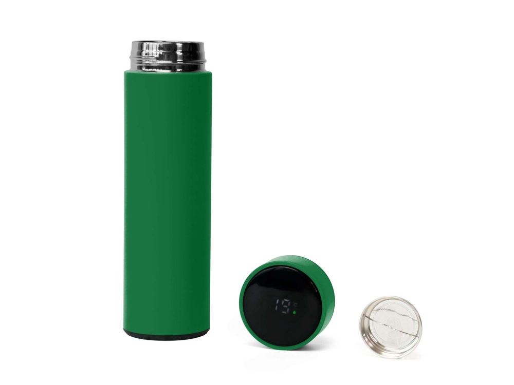 Термос из нержавеющей стали, покрытый цветным soft touch, с крышкой, в которой встроен термометр и LED дисплей, показывающий температуру внутри термоса. Объем: 500 мл. Упаковка: каждый термос в крафт коробке.