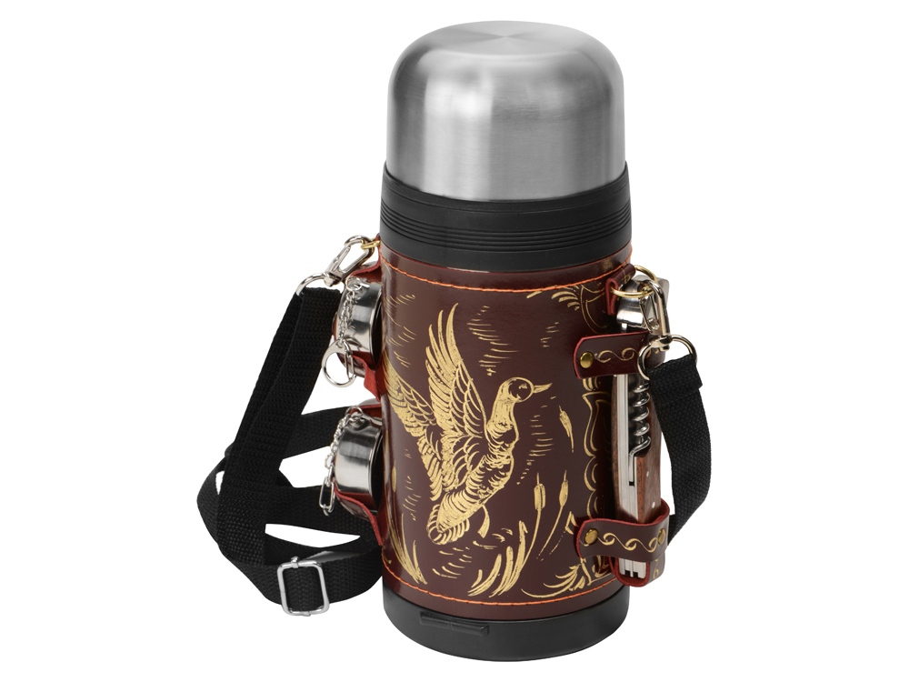 Отличный подарочный термос для дорогого вам человека! Включает в себя термос на 1,2 л в чехле из натуральной кожи с художественным выжиганием, 2 складных стакана и многофункциональный нож.