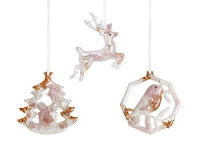 Набор из 3-х елочных игрушек: в форме оленя, снегиря и елки. Игрушки выполнены из ювелирной эпоксидной смолы и украшены галтовкой из натуральных минералов.