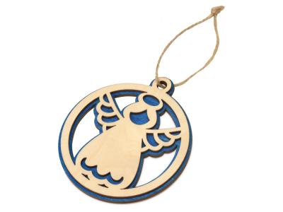 Елочная игрушка в виде главного символа праздника. новогоднего ангела – атмосферный и праздничный сувенир. Подвеска изготовлена из березовой фанеры и украшена тонировкой синего цвета, которая подчеркивает объемность игрушки и оттеняет текстуру неокрашенной части подвески. На одеждах ангела можно разместить ваши благопожелания или логотип.