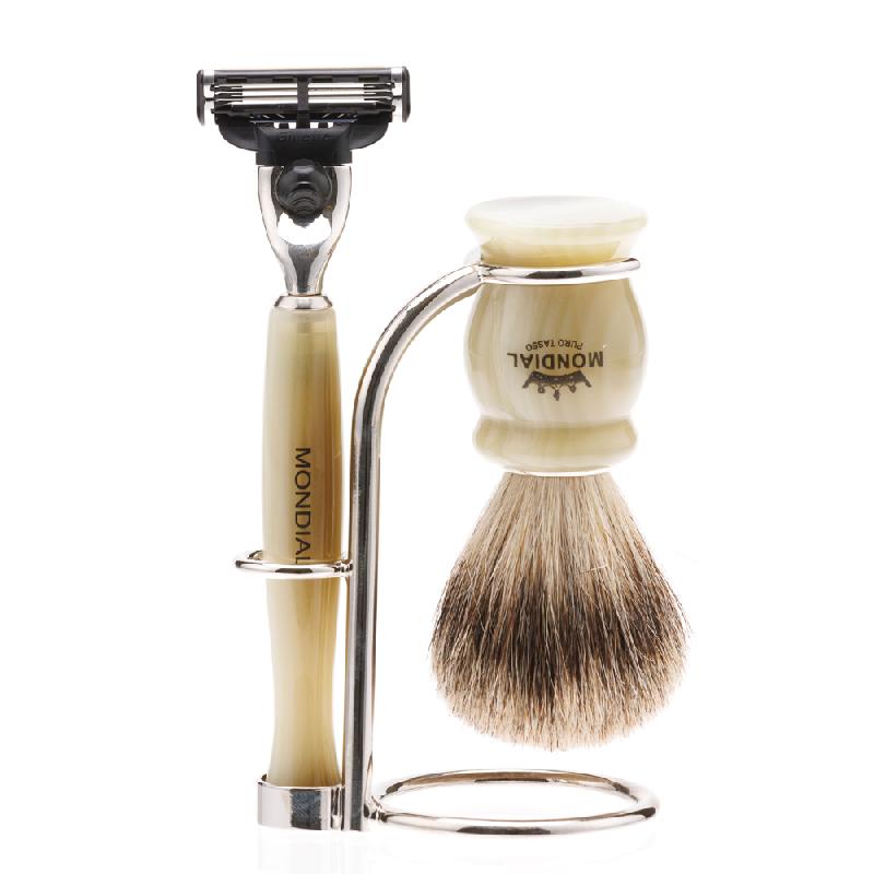 Бритвенный набор Mondial: станок, помазок, подставка; светлый и перламутр