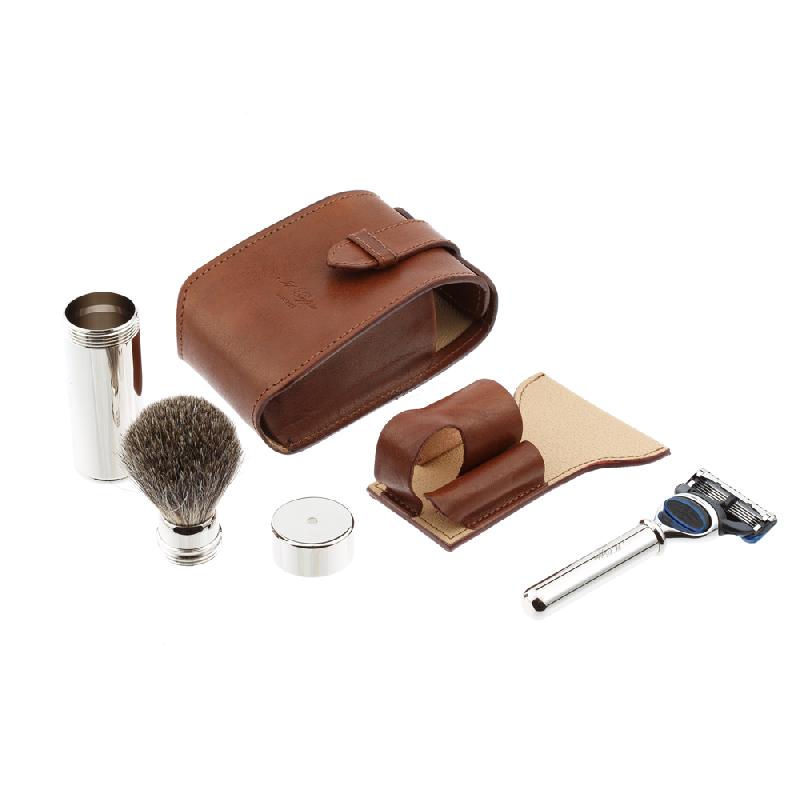 Дорожный бритвенный набор IL Ceppo в коричневом чехле из натуральной кожи: бритвенный станок FUSION - никелированная латунь, помазок - никелированная латунь, барсучий ворс
