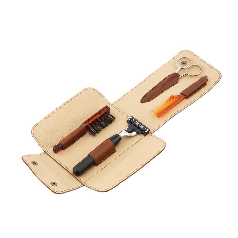 Чехол ручной работы из коричневой натуральной кожи, изготовленный во флорентийском стиле, плотно вмещает бритвенные аксессуары. Бритвенный станок из алюминия c лезвием Gillette MACH3 обеспечивает прекрасное бритье, оставляя кожу гладкой и мягкой. Щётка, расчёска и ножницы обеспечивают комфортный и качественный уход за усами и бородой.