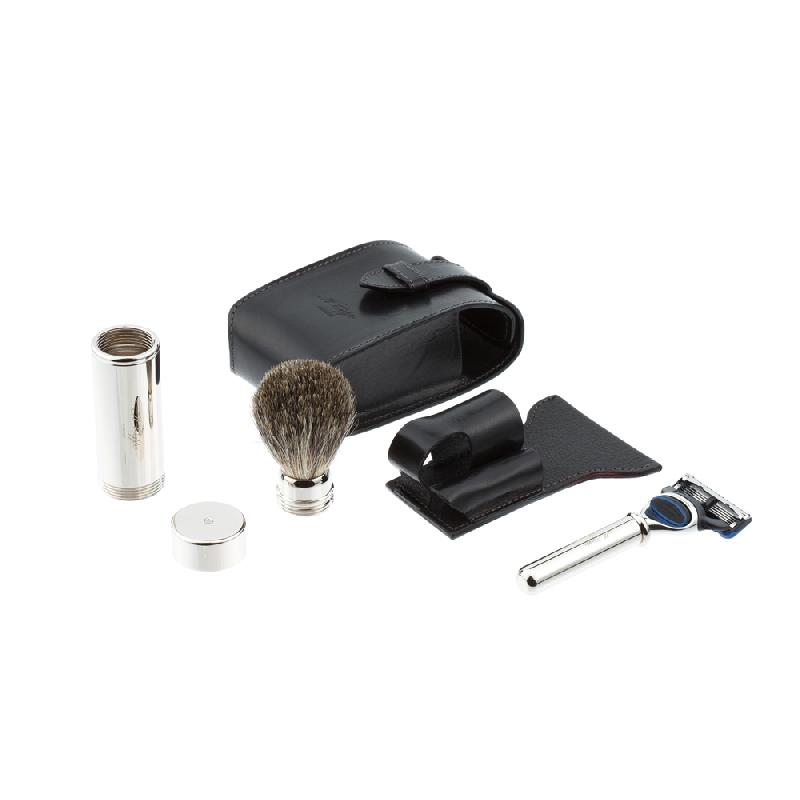 Дорожный бритвенный набор IL Ceppo в черном чехле из натуральной кожи: бритвенный станок FUSION - никелированная латунь, помазок - никелированная латунь, барсучий ворс