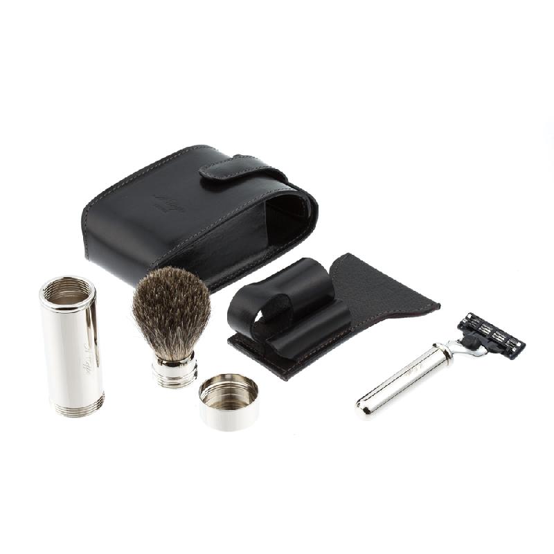 Дорожный бритвенный набор IL Ceppo в черном чехле из натуральной кожи: бритвенный станок MACH3 - никелированная латунь, помазок - никелированная латунь, барсучий ворс