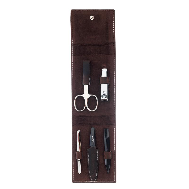Маникюрный набор Erbe, 5пр. Инструменты: ножницы для ногтей, книпсер, пинцет наклонный, пилка металлическая, двусторонний инструмент. Футляр: натур.кожа, цвет коричневый. Размер 8 х 12 х 3 см
