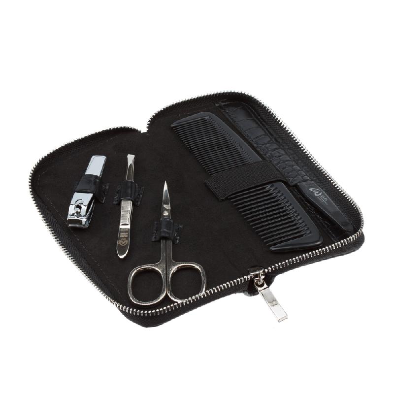 Маникюрный набор GD, 5 пр.(мужской дорожный набор). Инструменты: ножницы универсальные, пилка металлическая 12.5 см, пинцет скошенный, книпсер для ногтей 6 см, расческа. Футляр: искусственная кожа, цвет черный, фактура - крокодил