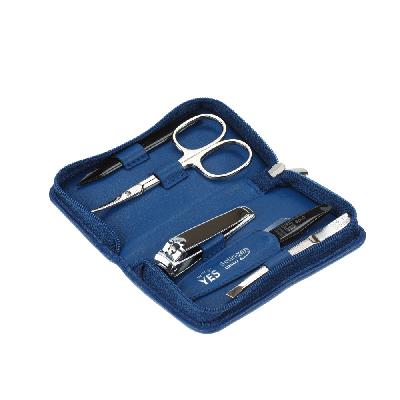 Маникюрный набор YES, 5 пр.: книпсер для ногтей, ножницы для кутикулы, пинцет скошенный, пилка металлическая, шабер двусторонний. Футляр: натуральная кожа, цвет синий. Размеры 10 х 6,5 х 2,5 см